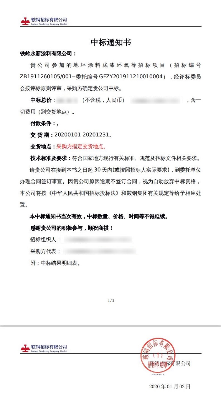 鞍鋼中標通知書