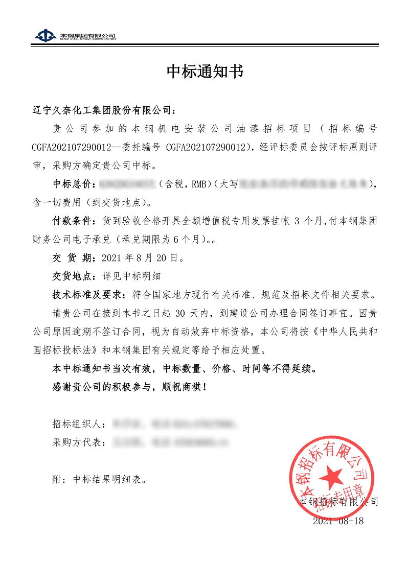 2021年8月18日,遼寧久奈化工集團(tuán)股份有限公司(以下簡稱遼寧久奈化工)收到本鋼集團(tuán)有限公司出具的《中標(biāo)通知書》,本鋼機(jī)電安裝公司油漆招標(biāo)項(xiàng)目。